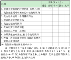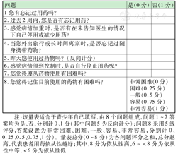 注:该量表适合于青少年自己填写,由8个问题组成,问题1~7答案均为是、否,分别计0、1分(其中问题5为反向计分);问题8采用5级评分,答案设置为非常困难、困难、一般、容易、非常容易,分别计0、0.25、0.5、0.75、1分)。量表总分(0~8分)为各问题评分之和,总分越高,代表患者用药依从性越好;其中,8分为依从性高,6~<8分为依从性中等,<6分为依从性低