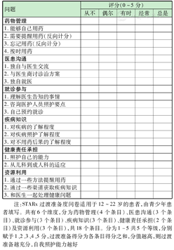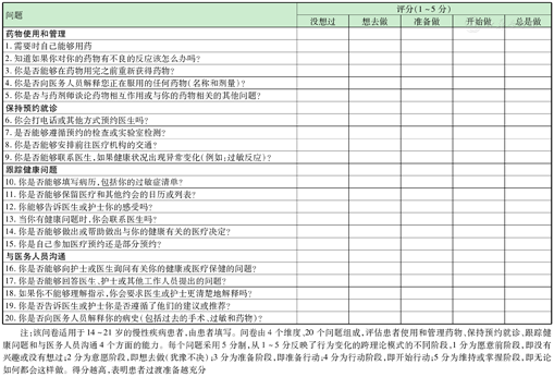 注:该问卷适用于14~21岁的慢性疾病患者,由患者填写。问卷由4个维度、20个问题组成,评估患者使用和管理药物、保持预约就诊、跟踪健康问题和与医务人员沟通4个方面的能力。每个问题采用5分制,从1~5分反映了行为变化的跨理论模式的不同阶段,1分为愿意前阶段,即没有兴趣或没有想过;2分为意愿阶段,即想去做(犹豫不决);3分为准备阶段,即准备行动;4分为行动阶段,即开始行动;5分为维持或掌握阶段,即无论如何都会这样做。得分越高,表明患者过渡准备越充分