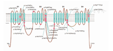 CACNA1E基因位于1号染色体,1q25q31,包含47个外显子,突变为常染色体显性遗传,编码长度为2 270个氨基酸的Cav2.3的关键亚基α1亚单位。电压门控钙离子通道在可兴奋细胞膜电位调节中发挥重要作用,影响神经信号的产生和传导,并参与神经递质的分泌等重要的生理过程。电压门控钙离子通道生物学功能关键结构为具有电压敏感性成孔α1亚基。α1亚单位在细胞膜上形成4个跨膜区域(图1),每个跨膜区域由6个螺旋肽段及其间的连接肽链组成,其中S4内含规则排列的正电荷残基,为通道的电荷感应部分,而S5和S6间含孔道区是通道的核心部分。Cav2.3是一种高电压激活、快速失活的R型钙通道,广泛表达于整个中枢神经系统,参与突触前、后神经递质释放[3]。此外,Cav2.3通道参与信号蛋白介导的轴突向树突的转化和神经系统发育过程中神经元转化方向的控制,同时Cav2.3通道被证明参与控制疼痛行为、恐惧生理学及髓鞘形成[4]。
