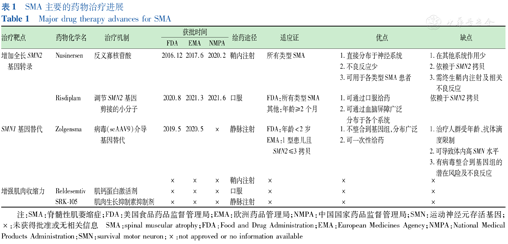 注:SMA:脊髓性肌萎缩症;FDA:美国食品药品监督管理局;EMA:欧洲药品管理局;NMPA:中国国家药品监督管理局;SMN:运动神经元存活基因;×:未获得批准或无相关信息 SMA:spinal muscular atrophy;FDA:Food and Drug Administration;EMA:European Medicines Agency;NMPA:National Medical Products Administration;SMN:survival motor neuron;×:not approved or no information available