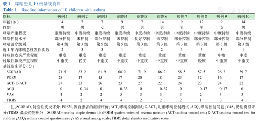 注:FeNO:呼出气一氧化氮;FEV1%pred:第1秒用力呼气量占预计值的百分比;FEV1/FVC:1秒率,即第1秒用力呼气容积与用力肺活量的比值;PEF%pred:最大呼气流量占预计值的百分比;C-ACT:儿童哮喘控制测试;ACT:哮喘控制测试;ACQ:哮喘控制问卷;基线时患儿均未处于哮喘急性发作期,部分患儿肺功能正常 FeNO:fractional exhaled nitric oxide;FEV1%pred:forced expiratory volume in the first second to the predicted value;FEV1/FVC:1 second rate is the ratio of forced expiratory volume to forced vital capacity in the first second;PEF% pred:large expiratory flow as a percentage of expected value;C-ACT:asthma control test for children;ACT:asthma control test;ACQ:asthma control questionnaire;at baseline,none of the children were in the acute attack stage of asthma,and some children had normal lung function