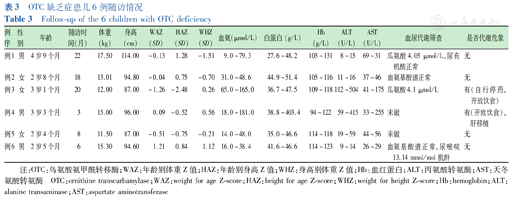 注:OTC:鸟氨酸氨甲酰转移酶;WAZ:年龄别体重Z值;HAZ:年龄别身高Z值;WHZ:身高别体重Z值 OTC:ornithine transcarbamylase;WAZ:weight for age Z-score;HAZ:height for age Z-score;WHZ:weight-for-height Z-score