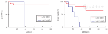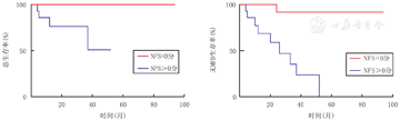 以单倍体异基因造血干细胞移植前的LOES评分和NFS对ALD患儿分组,分别以死亡以及发生MFD为结局事件进行生存分析(图3、图4)。