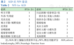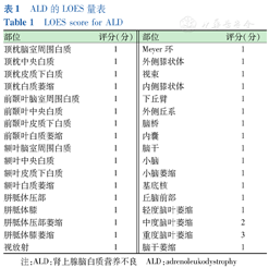LOES评分作为ALD疾病特异性评分,在1994年由LOES首次提出,并广泛应用于ALD的临床研究中。LOES评分根据ALD患者头颅MRI进行评分,评分系统0~34分[9]。NFS根据ALD患者的症状进行评分,评分系统0~25分[8](表1、表2)。
