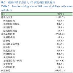 共收治109例SE患儿,排除6例(年龄>14岁2例,心理疾病4例)。符合纳入标准者103例,其中男43例,女60例;年龄1个月至11岁,中位年龄48个月。其中RSE 18例(17.5%),SRSE 6例(5.8%)。根据GOS评分,预后良好组78例,预后不良组25例,其中死亡5例,死亡原因为中枢性呼吸衰竭,病因为颅内出血和重症脑炎。103例SE患儿的病因基线资料见表3,其中61例患儿完成脑脊液检查,55例患儿完成基因、代谢病筛查。病因明确者仅占36.9%,63.1%的患儿病因不明。感染性疾病中以病毒性脑炎最多见,非感染疾病中以基因病和染色体病为主,其中确诊为线粒体疾病2例。代谢性疾病2例,分别为甲基丙二酸血症和鸟氨酸氨甲酰转移酶缺乏症。