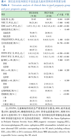 预后不良组患儿年龄较小(Z=-3.068,P=0.002)、血乳酸水平更高(Z=-6.085,P<0.001)、STEPSS评分和END-IT评分增高(Z=-6.956、-5.502,均P<0.001)、脑MRI异常比例增高(χ2=5.860,P=0.015)、合并发育迟缓的比例增高(χ2=16.756,P<0.001)、启动抗SE治疗时间长(Z=1.488,P=0.024)、治疗中应用呼吸机的比例和应用多种抗癫痫药物的比例均增高(均P<0.001)。但2组患儿在性别、惊厥发作形式、EEG和脑脊液检查异常的比例方面差异均无统计学意义(均P>0.05)(表4)。