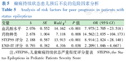 将SE预后结果作为因变量,赋值:预后不良=1,预后良好=0;将单因素分析中有差异的临床指标(血乳酸、是否合并发育迟缓、药物种类、MRI异常、启动抗SE治疗时间、应用呼吸机、STEPSS评分、END-IT评分)作为自变量,进行二分类Logistic回归分析,选择LR向前逐步回归法,逐步筛选出具有统计意义的指标,发现血乳酸水平增高、药物种类增多、STEPSS评分和END-IT评分增高是影响SE患儿预后的危险因素(表5)。