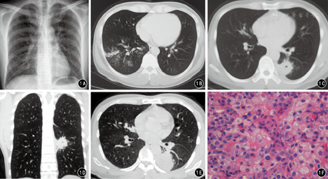 患者男,32岁,无明显原因出现发热2个月,最高体温39 ℃,咳嗽、咳痰,为黄色黏痰。外院按"肺炎"给予"阿奇霉素"治疗2周,体温降至正常,咳嗽、咳痰症状减轻。10 d前再次出现发热,主要于下午及晚间出现,咳白色黏痰,无寒战、盗汗,使用"阿奇霉素"体温控制不佳,于2014年3月5日收治西安交通大学医学院第一附属医院××科。否认肝炎、结核、疟疾等病史;患者久居西安,无疫区、疫情、疫水接触史。体检:体温37.3 ℃,脉搏102次/min,呼吸25次/min,血压113/78 mmHg(1 mmHg=0.133 kPa),神志清楚,精神尚可。实验室检查:白细胞10.46×109/L、中性粒细胞百分比88.01%,肝肾功能、电解质、凝血六项未见异常,结核菌试验弱阳性,红细胞沉降率16 mm/h,C反应蛋白、降钙素原、呼吸道病毒抗体、EB-DNA、CMV-DNA、TB-DNA、斑点试验未见明显异常。X线胸片:两肺纹理增重,右下肺可见淡薄的絮状模糊影(图1A﹚。胸部CT:右肺下叶背段见斑片状高密度渗出影﹙图1B﹚;40天复查CT示右肺下叶背段斑片状高密度影吸收,左肺下叶背段可见约31 mm×32 mm类圆形病灶,其内可见小的空洞影,边界不清,周围可见絮状渗出影,相邻胸膜增厚,胸膜腔少量积液﹙图1C、图1D﹚;2个月后复查CT示示左肺病灶范围增大,约41 mm×52 mm,胸腔积液较前增多。患者俯卧位于CT检查床上,行经皮左肺病灶CT引导下穿刺活检(图1E)。病理检查:肺组织慢性炎伴坏死及纤维组织增生及嗜酸性粒细胞浸润(图1F)。