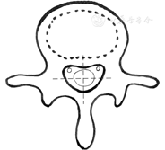 术后1年行CT扫描以评定术后硬膜外纤维化程度。纤维化程度评分方法:选取每位患者手术节段椎间盘硬膜外纤维化面积最大的CT片,并以椎管中点为中心作2条垂线,将椎管分为4个象限,每个象限内的硬膜外纤维化程度采用Ross等[5]发明的评分方法。0分:某一象限内无或仅有极少量纤维化;1分:某一象限存在纤维化组织,但面积<25%;2分:某一象限纤维化面积≥25%且<50%;3分:某一象限纤维化面积≥50%且<75%;4分:某一象限纤维化面积>75%。由1位主治医师在不知分组情况下进行评分,并由另1位副主任医师在不知分组情况下复核评分。如评分相同,则记录;如评分不同,则由第3位副主任级别进行评分,然后记录评分相同数据。见图3。