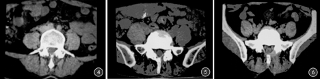术后1年,A组硬膜外纤维化程度CT评分均数为1.80,B组为1.15。A组与B组相比,差异具有统计学意义(P<0.01),见表3及图4,图5,图6。标准化问卷统计结果:A组手术治疗满意率为75.8%(69/91),B组患者手术治疗满意率为92.2%(106/115),差异有统计学意义(χ2=10.623, P<0.01)。