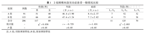 2005年1月—2011年1月入住莆田学院附属医院微创脊柱外科行椎间盘镜手术的腰椎间盘突出症患者共1 239例,其中206例符合标准纳入研究。206例中,男117例,女89例;年龄23~72岁,平均(44.2±8.5)岁;病程9周~3.5年,平均(8.1±5.2)个月。按手术方式分为切除黄韧带组(A组)和保留黄韧带组(B组)。2组患者的性别构成、年龄、病程及病变节段构成差异均无统计学意义(P值均>0.05)。见表1。