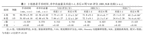 注:A组:切除黄韧带组; B组:保留黄韧带组; VAS:视觉模拟评分法; ODI: Oswestry功能障碍指数; SLR:直腿抬高角度:配对t检验:与术前1 d比较aP<0.01