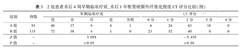 2组患者术后4周早期临床疗效、术后1年椎管硬膜外纤维化程度CT评分比较(例)