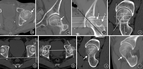 应用64层螺旋CT(Brilliance,PHILIPS,荷兰)行MSCT扫描。患者仰卧位。扫描参数:管电压120 kV,管电流250~300 mA,轴位螺旋扫描,螺距为0.9~1.0,扫描层厚1 mm,横轴位扫描,标准算法重建。扫描的原始图像传入CT工作站进行多平面重建。首先重建出髋关节标准冠状位图像,进行股骨颈斜矢状位重建和9等分的横断位重建(图2);选择斜矢状位中心层面和横断位第3和第5层测量髋关节的FAI相关解剖学异常。FAI相关解剖学征象指与FAI相关的股骨上端及髋臼的形态学参数的改变,包括股骨颈α角、股骨头颈偏距率、股骨头直径、股骨头颈交界部宽径、股骨颈上部宽径、髋臼前倾角、前髋臼角、后髋臼角及髋臼凹陷指数等,具体测量方法如图3,图4,图5所示。
