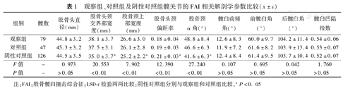 观察组和对照组髋关节的各解剖学参数差异均无统计学意义(P值均>0.05)。观察组和对照组头颈交界部宽度、股骨颈上部宽度及股骨颈α角均大于阴性对照组,股骨头颈偏距率则小于阴性对照组,差异均有统计学意义(P值均<0.05)。3组患者的股骨头直径、髋臼前倾角、前髋臼角、后髋臼角及髋臼凹陷指数差异均无统计学意义(P值均>0.05)。