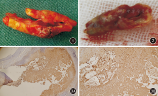 103例患者进行了CEA,获取103例颈动脉粥样硬化斑块。标本在体观察发现,斑块位于颈总动脉分叉部蔓延至颈内动脉者89例(86.4%),局限于颈总动脉或颈内动脉段者14例(13.6%);其中34例可见斑块表面粗糙、溃疡及附壁血栓(图1、2)。患者术后出现并发症4例,其中1例患者出现颈部血肿,经处理后未留后遗症;2例出现脑栓塞,经治疗后留有不同程度神经功能缺损症状,但生活可以自理;1例患者因颅内过度灌注而死亡。
