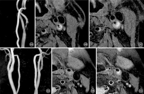 使用Philips Achieva 3.0 T MR扫描仪,头颈部神经血管专用16通道相控阵表面线圈(Philips公司)。扫描参数:(1)颈段3D时间飞跃法MRA,层数180,层厚0.75 mm,TR 19.6 ms,TE 3.5 ms,采集体素0.75 mm×1.35 mm×0.75 mm,信号平均次数2。(2)双反转恢复序列快速自旋回波T1WI,层数3,层厚3 mm,层间隔0.3 mm,TR 1beat,TE 20 ms,翻转角90°,采集体素0.493 mm×0.493 mm×3 mm,信号采集次数1。(3)双反转恢复序列快速自旋回波T2WI,层数3,层厚3 mm,层间隔0.3 mm,TR 3beats,TE 40 ms,翻转角90°,采集体素0.493 mm×0.493 mm×3 mm,信号采集次数1。双反转恢复序列快速自旋回波T1WI、T2WI采用心电门控技术。