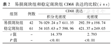 易损斑块组和稳定斑块组CD68表达的比较(