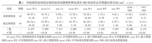 易损斑块组和稳定斑块组颈动脉粥样硬化斑块MR检查形态学测量结果比较(mm2,