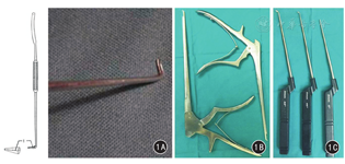(1)后纵韧带切除钩(图1A):钩与杆成90°,钩长4 mm,直径1.2 mm,尖端细而圆顿;沿钩中间有一槽,可容纳刀尖在其内滑动,保证切开后纵韧带时不损伤韧带下组织。(2)超薄型枪状咬骨钳(图1B):分100°和130°两种,口宽2.6 mm,厚1.2 mm,用于咬除增生肥厚的后纵韧带及骨化物。(3)颈椎前路专用小刮匙(图1C):备不同型号和角度(2 mm、0°,2 mm、45°,3 mm、45°)。上述工具均由中国上海康延医疗器械有限公司生产。