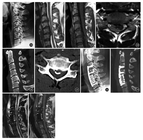 本组134例患者术后均获随访,随访时间6~36个月,平均(16.5±8.1)个月。术中发现37例患者韧带与硬脊膜无粘连,分离无硬脊膜破损;其余97例患者后纵韧带骨化物与硬脊膜粘连,在"安全减压间隙"下采用锐利神经剥离子成功分离92例,另外5例因骨化与硬脊膜融合一体,分离困难,在进行最大限度分离后,将骨化粘连的硬脊膜一起切除,术后发生脑脊液漏,其中术前CT横断面上椎管狭窄率30%~60% 1例,>60% 4例。4例经局部压迫并平卧3~5 d后脑脊液漏停止,1例顽固性脑脊液漏患者经反复穿刺抽吸并加压治疗1个月后愈合。本组无一例患者出现感染或者脊髓损伤。术后JOA评分8~16分,平均(14.9±2.7)分,与术前相比明显提高,差异有统计学意义(t=2.210, P<0.05)。术后1周JOA评分改善率41.6%~92.3%,平均82.1%±19.0%,其中疗效优70例,良49例,可15例,优良率88.8%。X线片定期随访发现植骨在6~ 12个月内融合,平均(7.1±0.9)个月。术后行颈椎MRI及CT检查,提示骨化物切除满意,硬膜囊及脊髓形态恢复良好。典型病例见图3。