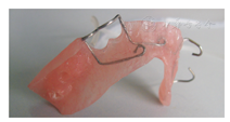 采用局部麻醉、口内切口。根据患者影像学资料选取囊肿近中心处定位为开窗口,且考虑便于囊肿塞的戴取,尽量保留病变区的牙齿;也可拔除无法保留的牙齿作为开窗口。切除直径约2 cm大小黏骨膜瓣,切取部分囊壁组织送病理学检查。囊腔内的牙齿如为正常恒牙且可正常就位(包括矫正治疗)则予保留,无法保留的牙齿可根据情况行同期或Ⅱ期拔除。对于多房性病例应尽可能去除囊腔分隔,形成单一囊腔;如连通困难,亦可制备两个开窗口,以保证囊肿明确的开窗减压效果。吸尽囊液,生理盐水冲洗囊腔,囊腔内填塞碘仿纱条并自开窗口引出。1周后抽出纱条,取模制作囊肿塞(图1)。术后指导患者每日以注射器自开窗口冲洗囊腔,冲洗后持续佩戴囊肿塞。开窗减压术后拍摄曲面体层X线片和口腔锥形束CT,观察患者囊腔缩小速度,若速度明显减慢或囊腔直径小于2 cm,可行Ⅱ期刮治术。