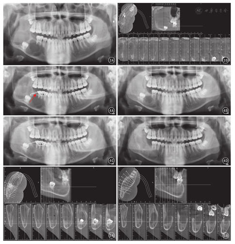 典型病例:患者男,17岁,因右面部肿胀4个月入院。专科检查:颜面部不对称,右面部肿胀,右下唇麻木,张口轻度受限,开口型及咬牙合基本正常,右下颌升支及右下颌磨牙区前庭沟膨隆,触诊有"乒乓球"感。右下颌牙齿无松动。曲面体层X线片示:右下颌骨大型囊性占位,边界清楚,上自乙状切迹,下至下颌角,前达44根尖区,囊腔内下颌下缘牙齿1枚。口腔锥形束CT示:右下颌骨大范围骨破坏,下颌升支及44至下颌角区仅剩余部分骨皮质。根据影像资料,46远中存在分房间隔,确定开窗口选择在此处牙槽嵴顶。治疗方法:Ⅰ期采用局部麻醉下开窗减压术,于46远中做一直径约2 cm的切口,见牙槽嵴吸收明显,暴露囊壁后切取部分送病理学检查。吸尽囊液,打通囊腔间隔,尽量将囊壁与开窗口黏膜缝合,反复冲洗囊腔,碘仿纱条填塞并自开窗口引出。1周后制作带卡环的囊肿塞。嘱患者每日餐后自开窗口冲洗囊腔。Ⅰ期术后每月复诊进行临床及影像学检查,1年患者面形基本恢复且囊腔缩小明显,20个月行Ⅱ期刮治术。Ⅱ期手术自Ⅰ期手术的开窗口进入囊腔,刮尽残余病变组织并拔除囊腔内牙齿;开窗口予以严密缝合。术后继续随访,口腔锥形束CT可见囊腔继续缩小,至术后24个月可见仅开窗口下方残余一碟形缺损,余囊腔被新骨充填。见图2, 图3, 图4, 图5。