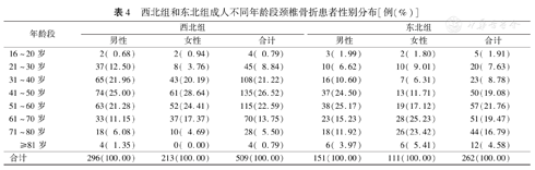 在收集的颈椎骨折病例中,西北组509例,男296例(58.15%),女213例(41.85%),男女比为1.39∶1;东北组262例,男151例(57.63%),女111例(42.37%),男女比为1.36∶1;两组性别构成比差异无统计学意义(χ2=0.019,P>0.05)。比较两组各年龄段性别分布,除21~30岁(χ2=7.180,P<0.01)和41~50岁(χ2=5.596,P<0.05)两个年龄段性别分布差异有统计学意义,其余各年龄段性别差异均无统计学意义(P值均>0.05)。见表4。西北组和东北组患者年龄分别为48(20)岁和57(21)岁,差异有统计学意义(Z=6.405,P<0.01)。西北组41~50岁年龄段患者最多,占26.52%(135/509);男性、女性患者均为41~50岁年龄段最多,所占比例分别为25.00%(74/296)和28.64%(61/213)。东北组51~60岁年龄段患者最多,占21.76%(57/262);男性患者以51~60岁年龄段为最多(25.17%,38/151),女性患者以61~70岁年龄段为最多(25.23%,28/111)。西北组509例中中青年和老年患者分别有407例(79.96%)和102例(20.04%),东北组262例中分别为155例(59.16%)和107例(40.84%),两组差异有统计学意义(χ2=37.873,P<0.01)。两组各年龄段骨折例数呈单峰分布,两组患者各年龄段构成差异有统计学意义(χ2=61.180,P<0.01)。
