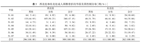 西北组和东北组成人颈椎骨折的节段及其性别分布[例(%)]