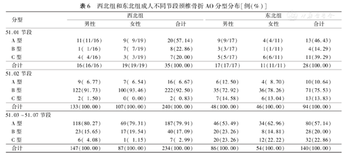 两组51.01节段骨折类型均多为A型,51.02节段均多为B型,下颈椎当中两组均以51.03~51.07节段A型最为常见。各节段两组比较,骨折最常见的类型相同,但是次高发的骨折类型却不相同。51.01节段中,西北组次高发骨折类型为B型(22.86%,8/35),而东北组为C型(39.29%,11/28);51.02节段中,西北组A型(6.67%,16/240)为次高发类型,而东北组为C型(13.83%,13/94);在下颈椎(51.03~51.07节段)骨折中B型(17.09%,40/234)患者在西北组次高发,但是东北组患者中C型(22.86%,32/240)比B型更为多见。