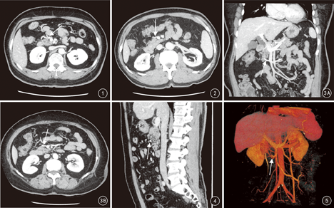 采用64排螺旋CT机(Light Speed VCT 64, GE Healthcare,美国)与德国Ulrich双筒高压注射器。患者取仰卧体位,头端朝向管球,扫描范围包括膈顶至髂棘。扫描参数:管电压为120 kV,管电流为250~400 mA,螺距为0.984,探测器宽度64×0.625 mm。重建门静脉期轴位、冠状位及矢状位图像层厚及层距均为1 mm,图像采用窗位30~50 HU,窗宽350~450 HU。