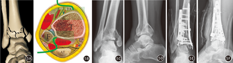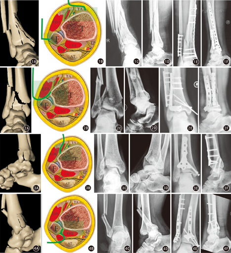 Pilon骨折为高能量垂直暴力所致的距骨对胫骨的撞击损伤,骨折累及胫骨远端负重关节面和干骺端,属于关节内骨折,约占下肢骨折的1%,占胫骨骨折的3%~10%[1]。手术恢复踝关节功能,胫骨远端关节面解剖重建,支撑接骨板内固定是Pilon骨折经典的治疗原则[2];但术中骨折端的完整显露、关节面的解剖重建、合理有效固定是治疗的重点及难点。目前,Pilon骨折的分型主要有AO/OTA分型和Rüedi & Allgöwer分型:AO/OTA分型虽然对骨折的各种形态有较详细的描述,但太复杂 [3];Rüedi & Allgöwer分型则太简单。这两种分型都属于形态学分型,对手术决策不能提供实际指导意义。同时Rüedi和Allgöwer提倡的传统手术入路需对胫骨远端进行广泛分离,常常造成感染(发生率0~55%)和伤口裂开 [4]。