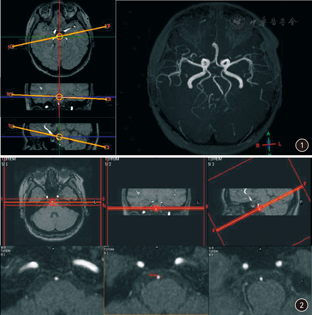 应用荷兰Philips MR仪自带VolumeView软件对MRA资源影像进行多平面重组。在软件处理界面的矢状位上选择基底动脉显示清楚、连续的层面,以此为定位图。分别选择基底动脉近、中、远段的中点3处,截面为圆形或近似圆形,避开有小脑前下动脉、小脑上动脉等大血管分支开口处,以层厚2 mm、间隔1 mm、垂直于基底动脉走行方向进行图像重组(图1)。