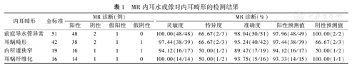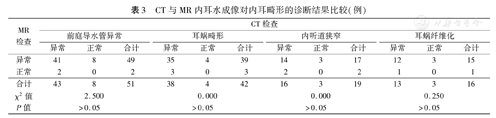 观察MR内耳水成像与螺旋CT两种检查方法对内耳畸形的检出结果,并以手术诊断为金标准,比较两种方法检测的灵敏度、特异度、准确度、阳性预测值和阴性预测值[5]。