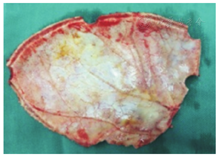 自体颅骨在初次术后取下,在无菌条件下去除骨瓣表面的软组织。生理盐水反复冲洗,0.1%庆大霉素盐水浸泡30 min。无菌敷料包裹并放入乳胶手套内,重复交替包裹3层。包扎完好,标记姓名、年龄、性别、左右侧,放入(-196~-198 ℃)液氮中保存备用,并在专用记录本上作对应登记。修补术前取出骨瓣在37 ℃生理盐水中解冻(图1),复合碘浸泡5~10 min,再次用生理盐水冲洗干净。骨瓣中央钻孔若干个,直径2 mm,钻下骨组织进行培养,并送病理检查。对于骨折成2片或3片者,对合骨折处,于骨折线两侧颅骨钻孔处对称及交叉穿入丝线,并对应打结,即可复位骨折片且不影响骨瓣的稳固。