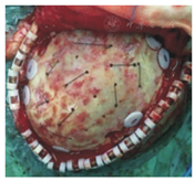 病例纳入标准:骨窗头皮凹陷者;无颅内感染或头皮切口局部感染者;行初次减压术后3~6个月颅内压正常者;家人同意使用自体颅骨者。病例排除标准:骨窗头皮未见明显凹陷或膨出者;原切口愈合不佳者;骨瓣碎裂3片以上或者3片对合后影响复位牢固者;家人要求使用其他材料者。