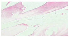 液氮保存后的自体颅骨外观如新鲜骨瓣(图1)。钻孔所得患者骨屑细菌培养均为阴性,病理检查可见成骨细胞及骨小梁(图3)。