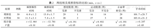 两组间比较显示,观察组麻醉操作时间短于对照组,麻醉起效时间长于对照组,运动完全阻滞率低于对照组,差异均有统计学意义(P值均<0.01);而在感觉阻滞效果、止血带耐受、手术时间等方面两组比较,差异均无统计学意义(P值均>0.05)。见表2。