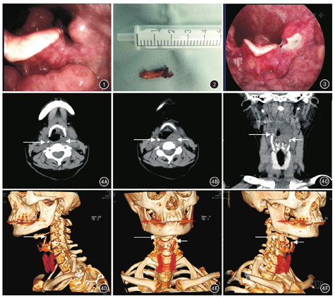 患者女,48岁,因"咽部不适伴异物感5个月"于2017年2月28日入院。患者5个月前无明显诱因出现咽部不适,伴异物感,在当地医院就诊,喉部CT示左侧咽侧壁小结节样隆起。为求进一步确诊与治疗,患者来嘉兴市第一医院就诊,喉动态镜检查见左侧咽侧壁光滑囊肿样新生物(图1),拟诊喉咽部囊肿收住院。专科检查:左咽侧壁见囊肿样新生物,约0.8 cm×1.0 cm×0.8 cm大,触诊质硬,颈部淋巴结未及肿大。2017年3月2日全身麻醉下行显微支撑喉镜下CO2激光喉咽部囊肿切除术。术中采用CO2激光沿肿物周边切割分离,见黏膜下骨性肿物呈圆棒状延伸,根部位于喉咽部外下方,与周边分界清;喉息肉钳触之为骨质,用喉息肉钳咬住并左右推动该骨质时可触及甲状软骨随之活动,考虑左侧甲状软骨上角变异,向内侧方向增生、异位。术中暴露甲状软骨上角,并用喉息肉钳部分骨质折断,取出长约1.8 cm、直径约0.4 cm的棒状骨质(图2),创面用CO2激光止血。病理结果示:送检标本为骨质伴横纹肌组织及纤维组织。术后第3天复查喉镜见创面伪膜生长良好(图3)。术后第2天复查喉部CT 3D重建示:左侧甲状软骨变异的上角已部分截短,较右侧上角显著缩短(图4)。患者痊愈出院后随访3个月,患者自觉咽部异物感已消失,无其他不适症状。