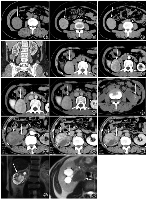 由腹部影像诊断经验丰富的副主任医师和主治医师各1名共同完成阅片,如产生分歧,则通过讨论达成一致。观察内容包括:肿瘤生长部位、病灶数目、大小、形态、边界、肿瘤的密度或信号、注药后强化程度和强化方式、有无肾周侵犯、淋巴结或远处转移等。病灶平扫以肾实质密度或信号作为参照。增强扫描CT值较平扫增加程度低于20 HU为轻度强化,20~40 HU为中度强化,高于40 HU为明显强化,与肾皮质强化相似或高于肾皮质为显著强化,以肿瘤感兴趣区的最高CT值为准。
