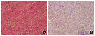 6例中,3例行根治性肾切除手术,3例行保肾手术。肿瘤最大径范围2.5~7.0 cm,切面呈灰白或灰红色,质韧,包膜或假包膜完整,与周围无明显粘连。1个肿瘤坏死囊变明显,其它6个均未见明显坏死囊变。2个瘤体内见斑点状钙化灶。1例肾门及主动脉旁淋巴结反应性增生。镜下肿瘤细胞呈梭形,呈编织状或交错状排列(图6),部分区域细胞丰富,但未见明显核分裂像,部分区域可见玻璃样变及粘液间质。免疫组织化学检查:7个肿瘤SMA(图7)、VIM均呈阳性表达,HMB45均呈阴性表达;5个肿瘤Ki-67指数阴性、1个Ki-67指数<2%,1个Ki-67指数<3%。本组有5例术后随访1~11年均未见复发或转移,1例失访。