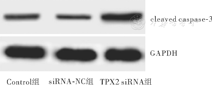 Control组、siRNA-NC组、TPX2 siRNA组细胞转染后,在37 ℃、5% CO2饱和湿度的培养箱中培养48 h,按照蛋白提取试剂盒提取细胞中的总蛋白。每组取100 μg蛋白样品,加入1∶1体积的2×Loading buffer煮沸5 min。按照每孔加入50 μg上样,90 V电压电泳,观察溴酚蓝进入分离胶和浓缩胶交界处后,120 V电压电泳至结束。应用硝酸纤维素膜以200 mA电流转膜90 min。转膜后的硝酸纤维素膜室温下5%牛血清白蛋白中封闭60 min。硝酸纤维素膜再用PBS加Tween 20(PBS plus Tween 20, PBST)漂洗5 min,3次。漂洗后的硝酸纤维素膜加入兔抗TPX2一抗(1∶1 000)、兔抗cleaved caspase-3一抗(1∶1 000)、兔抗GAPDH一抗(1∶2 000)在4 ℃孵育过夜。次日用PBST漂洗5 min,3次。然后分别与羊抗兔辣根过氧化物酶标记的二抗(1∶2 000)室温下孵育60 min。ECL化学发光液显色。美国Bio-Rad伯乐GelDocXR+凝胶成像分析系统拍照,Quantity-One软件分析目的蛋白表达水平。以GAPDH为内参计算各组蛋白的相对表达量。目的蛋白的相对表达量=目的蛋白灰度值/GAPDH灰度值。