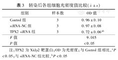 siRNA-NC组细胞OD值与Control组相比差异无统计学意义(P>0.05);而TPX2 siRNA组细胞OD值明显低于Control组和siRNA-NC组,差异均有统计学意义(P值均<0.05)。结果提示,干扰TPX2表达能够抑制肺癌细胞的增殖。见表3。