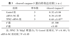 TPX2 siRNA组cleaved caspase-3蛋白的表达明显高于Control组和siRNA-NC组,差异均有统计学意义(P值均<0.05);siRNA-NC组cleaved caspase-3蛋白的表达与Control组比较,差异无统计学意义(P>0.05)。结果提示,TPX2 siRNA能够促进肺癌细胞中cleaved caspase-3的表达,促进肺癌细胞凋亡。见图3和表5。