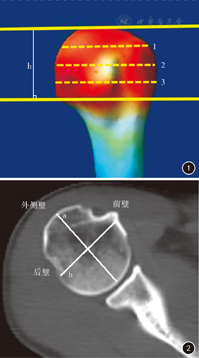 应用美国GE公司Light Speed 16型多排CT对肩部行轴位扫描,平扫范围从肩峰到肱骨中上段。扫描参数:电压120 kV,电流240 mA,层厚10 mm。数据经AW 4.6工作站(GE Healthcare,USA)处理后,使用DICOM影像格式导出。