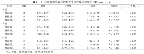 51名健康志愿者右侧肱骨头区骨皮质厚度的比较(mm,