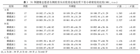 本研究共纳入健康志愿者51人,男27人,女24人;年龄20~88岁,平均48.69岁。所有健康志愿者行肩部CT扫描,按照年龄分为3组:A组(20~39岁)17人;B组(40~59岁)18人;C组(≥60岁)16人。应用骨皮质测量软件Stradwin 5.2读取CT原始影像数据,生成骨皮质的彩色分布图。垂直于肱骨头关节面,将肱骨头高度四等分后建立相互平行的3个横截面;在横断面1、2、3,测量分析肱骨头区前壁、外侧壁和后壁的骨皮质厚度、骨皮质密度和皮质下骨小梁密度。