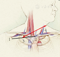 注:1为右肱骨头内缘;2为胸骨上窝;3为穿刺点(为1和2的中点);4为甲状软骨