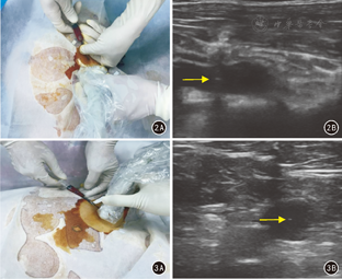 改良组穿刺总成功率为98%(49/50),传统组为94%(47/50),其余两组均为100%。改良组、改良B超组和传统B超组的一针成功率均在90%以上,较传统组有明显提高,差异有统计学意义(χ2=27.575, P<0.01)。见表2。
