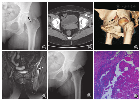 患者女,44岁,"左髋关节疼痛伴活动受限20 d"入院。患者发病前自感左髋部不适,活动后加重,20 d前无明显诱因下出现左侧髋关节针刺样剧痛,于当地医院"抗感染治疗"效果欠佳,遂转入徐州医科大学附属医院关节外科进一步治疗。患者平素体健,无严重基础疾病,否认外伤史。体格检查:左髋部皮肤温度、颜色正常,左下肢肌力Ⅳ级,左腹股沟点深压痛阳性,左髋关节各方向主动、被动活动明显受限,以外展为著。左腹股沟疼痛VAS 5分。实验室检查:外周血WBC 6.8×109/L,中性粒细胞比例0.59,淋巴细胞比例0.36,红细胞沉降率63 mm/1 h,C反应蛋白20.40 mg/L。影像学检查:双髋关节正位X线片示左髋臼缘骨皮质欠光整,局部斑片状骨密度影(图1A);髋关节CT三维重建示左侧髋臼前上缘骨质形态不整,股直肌起点部示结节状骨样密度影,边缘示小片状高密度影(图1B、图1C);髋关节MRI平扫示左侧髋臼前上方骨质示斑片状短T2信号影,临近软组织示片状长T2信号影(图1D)。初步诊断为:左髋部钙化性肌腱炎。于2017年3月3日在全身麻醉下行左髋关节钙化灶清除术。于左髂前上棘下2 cm处作一3.5 cm斜切口,逐层剥离软组织,在左髂前下棘前下方见一1 cm×2 cm灰白色钙化灶,用髓核钳取出并送病理检查。术后第3天复查髋关节正位X线片,未见左髋关节钙化灶(图1E)。病理检查结果:软骨组织内见纤维组织增生,炎细胞浸润,内见多量钙化小体(图1F)。术后第2天,患者左髋关节疼痛明显减轻,可自主行走,VAS 2分;术后第3天,局部疼痛症状完全消失;术后8个月随访,左髋部主动活动正常,活动后髋关节无疼痛感。